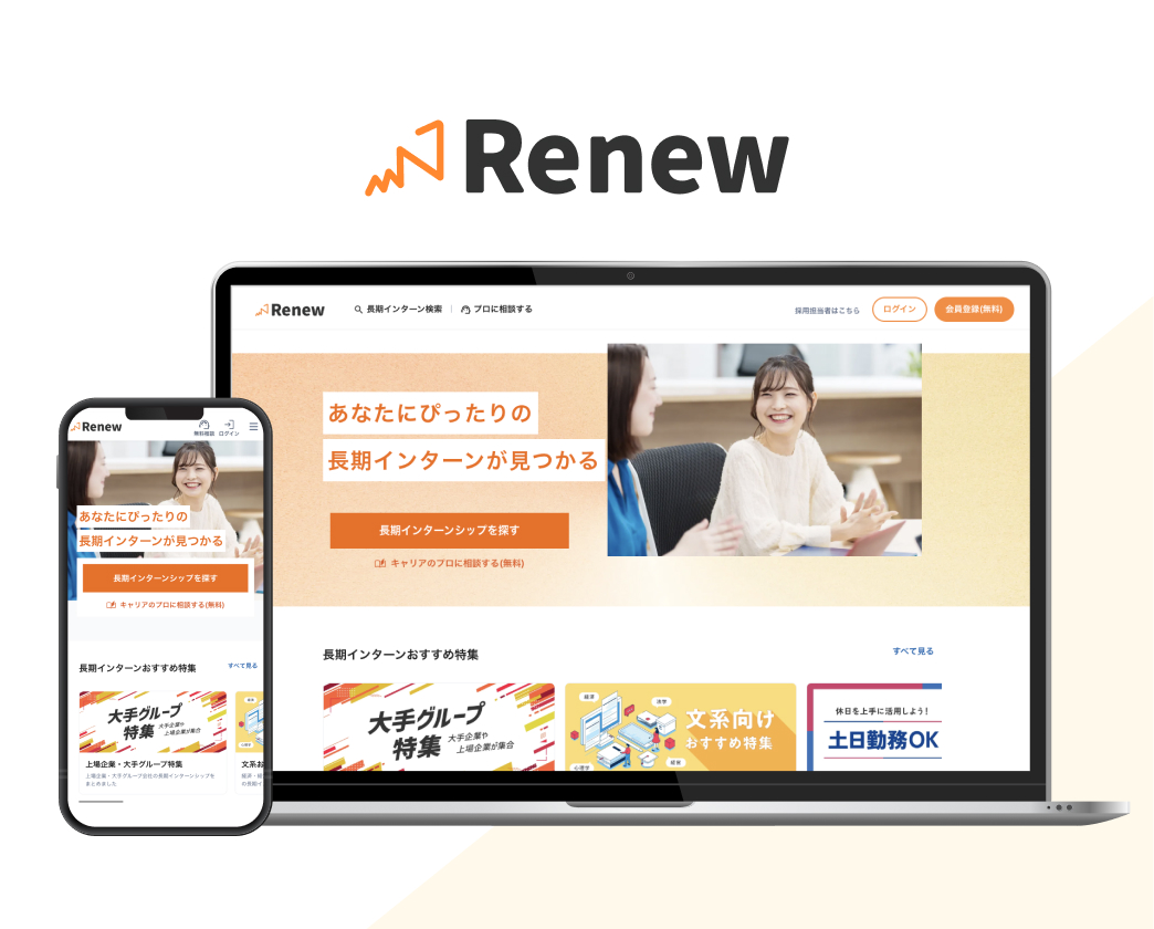 Renewは、長期インターン専門の求人サイトです。累計15,000名以上の学生が利用し、上場企業・大手企業を含む厳選された長期インターン求人を1,000件以上掲載しています。プロのキャリアアドバイザーによる個別相談サポートや、企業から直接スカウトを受け取る機能など、自分に合った探し方で、理想の長期インターン先を見つけることができます。